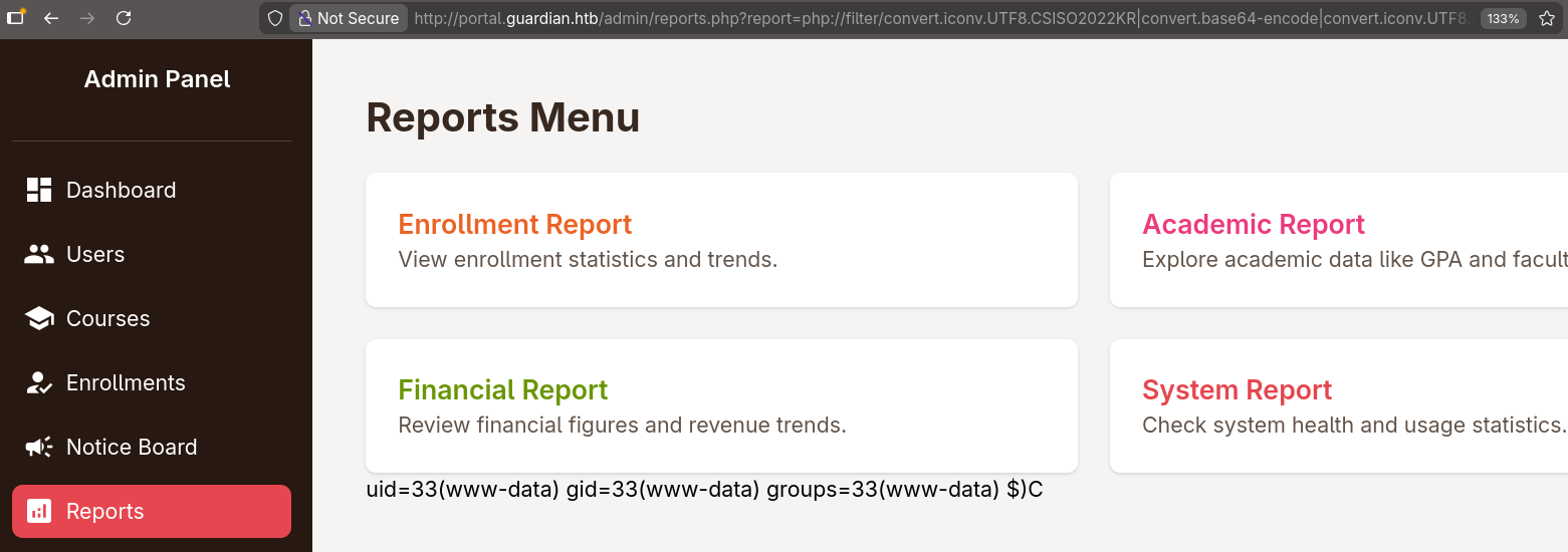 guardian is a hard Linux box, hosting a php based university website, this writeup involved leveraging default student credentials, session hijacking via CVE-2025-22131 (XSS) in phpspreadsheet, and an administrative CSRF vulnerability resulting from a flawed global token pool implementation. Access was further escalated by bypassing a restricted LFI whitelist through PHP filter chains to achieve RCE as www-data, followed by lateral movement via sha256 hash cracking and vertical escalation through a writable Python script and an Apache module injection via safeapache2ctl