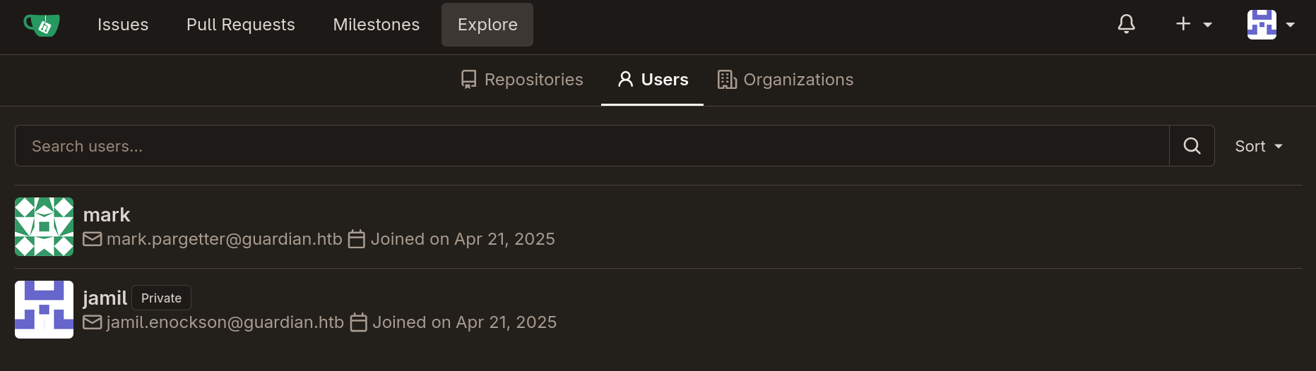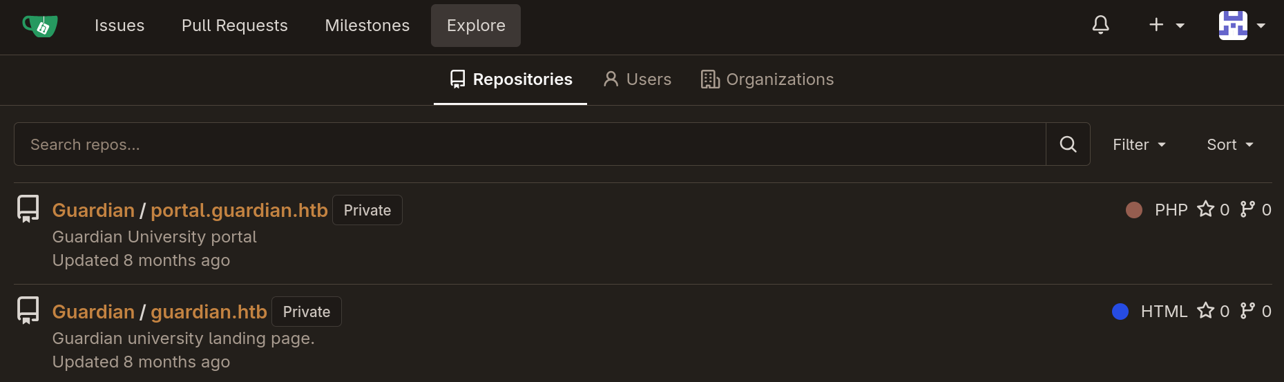 I used ffuf to fuzz for other hidden subdomains and I found gitea.guardian.htb